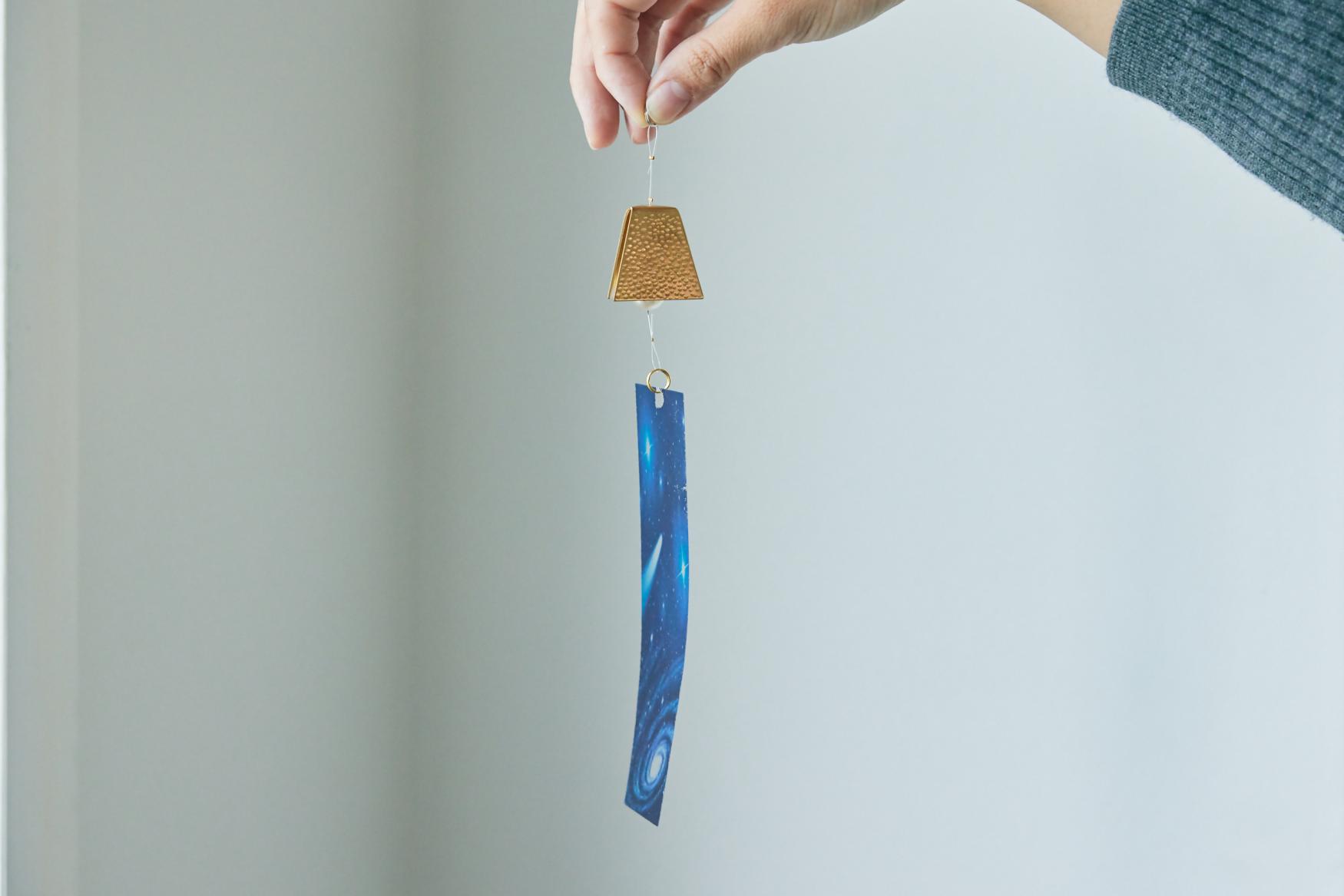 風鈴の外枠を模った真鍮(金属)に,鏨や金槌を打ち付けて好きな模様をつくり,好みの短冊を付けて完成する風鈴づくり。