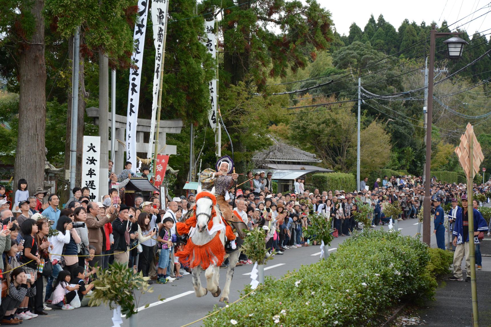 創建年代は不明。流鏑馬行事が伝わります。島津忠良が天文7年(1538)年に加世田城を攻める際に必勝祈願をし流鏑馬の奉納を誓ったところ、その夜のうちに加世田城を攻略できたので、奉納するようになったといいます。2人の射手が3回ずつ射ます。祭祀日は11月23日で、横馬場参道でおこなわれます。