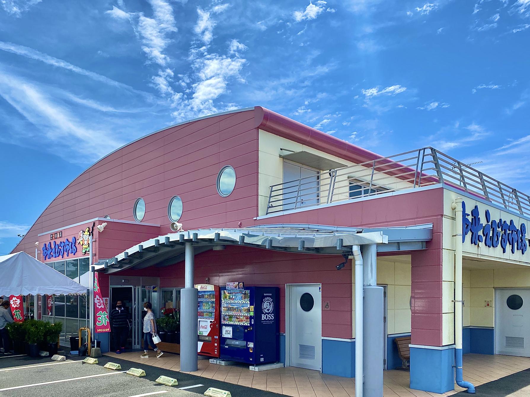 「蓬莱」とは中国で古く仙人が住む場所のことを指した言葉で、ここ江口浜の崖がその場所を彷彿させることから「江口蓬莱」と呼ばれてきました。地質的には南九州を広く覆っている入戸火砕流(いわゆるシラス)であり、周辺に白く美しい砂浜が生じることにもつながっています。江口蓬莱館は海に面した立地で、レストランからの眺望も最高、新鮮な魚介類や地元野菜を求めて多くの方が訪れる人気の物産館です。