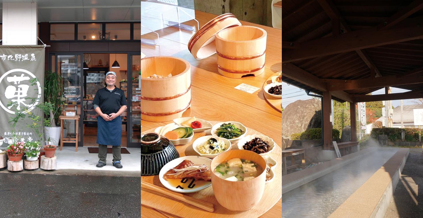 薩摩川内市にある市比野温泉は、湯治場として江戸時代から続く名湯。懐かしくレトロ感漂う通りには、おしゃれな米店や温泉に入れる和菓子店、新しく開業した温泉施設などが並びます。