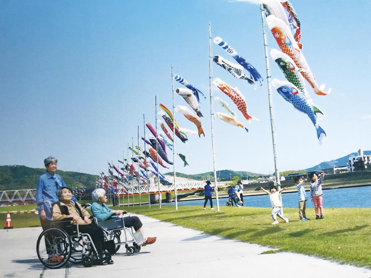 河川敷の広々としたスペースで、キッズサッカーやバーベキュー(要予約)を楽しむことができ、4月には120匹ほどの鯉のぼりが泳ぐ中、「鯉のぼりフェスティバル」も開催。