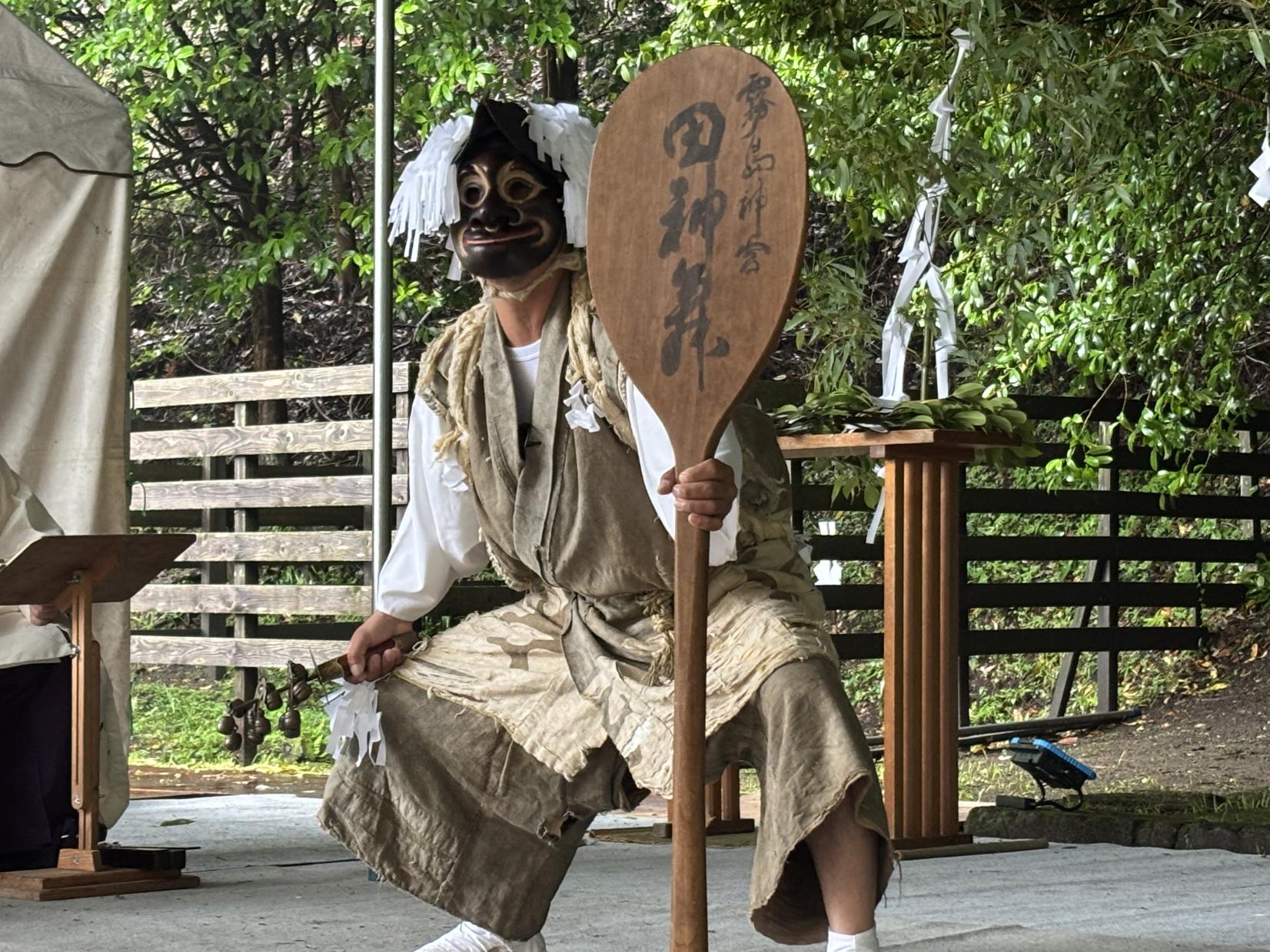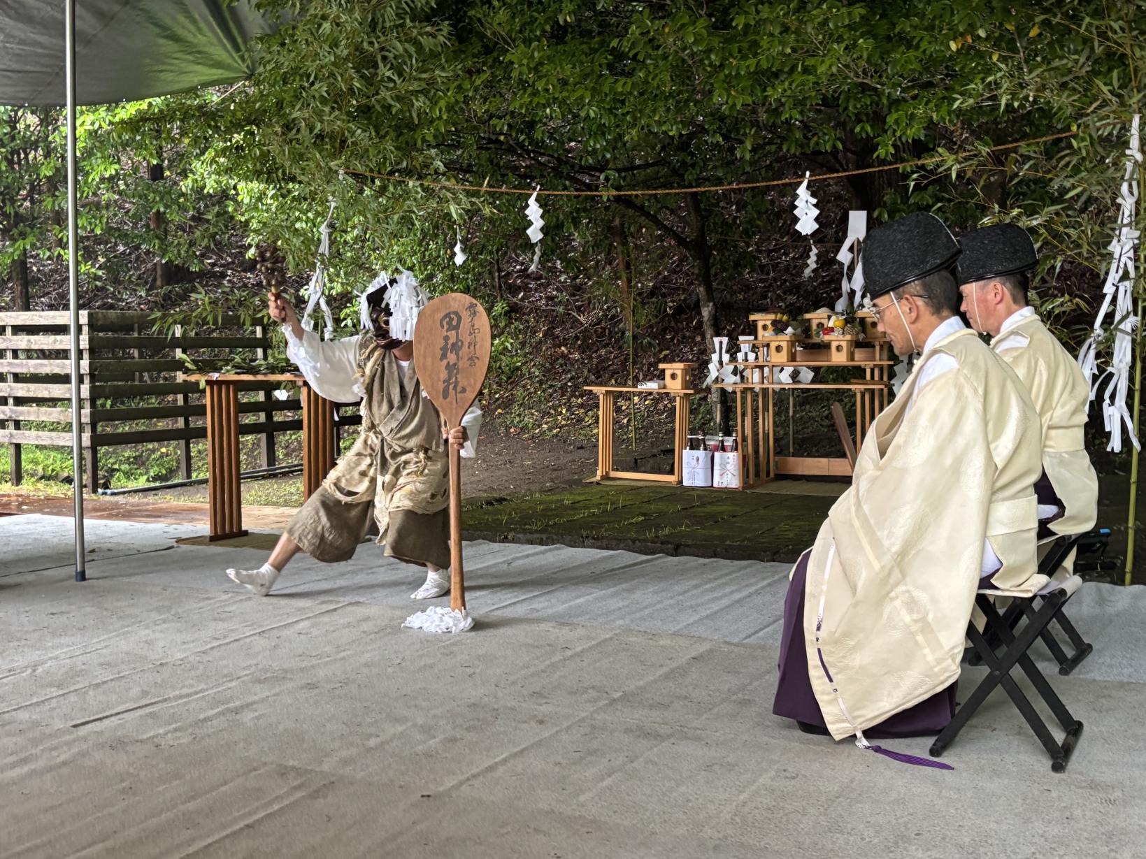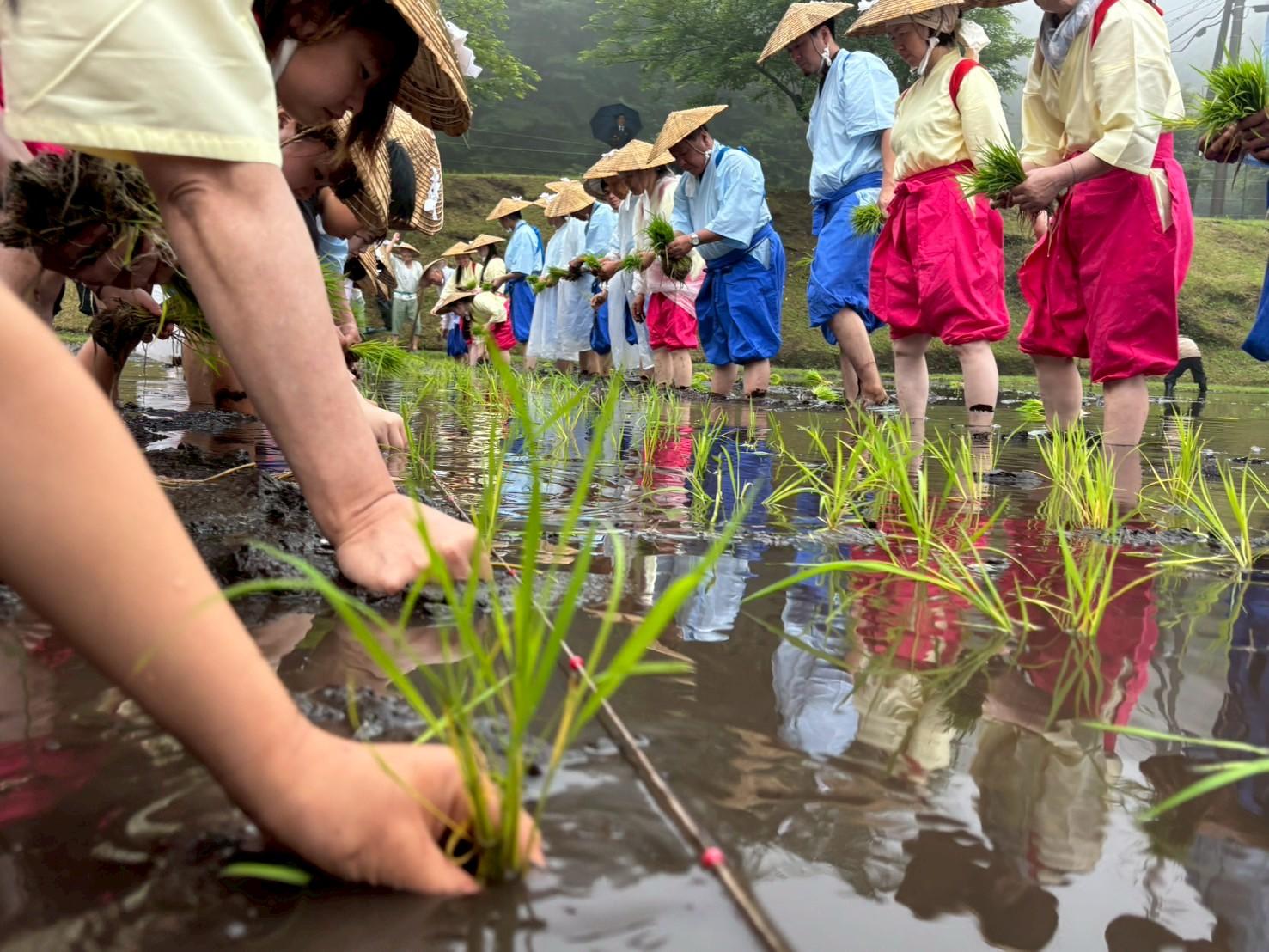五穀豊穣を祈願する神事「田の神舞」が奉納された後、田植え装束の約100名の氏子と地元の小学生が約50アールの水田に田植えを行います。平成3年3月22日に県の無形民俗文化財に登録されました。