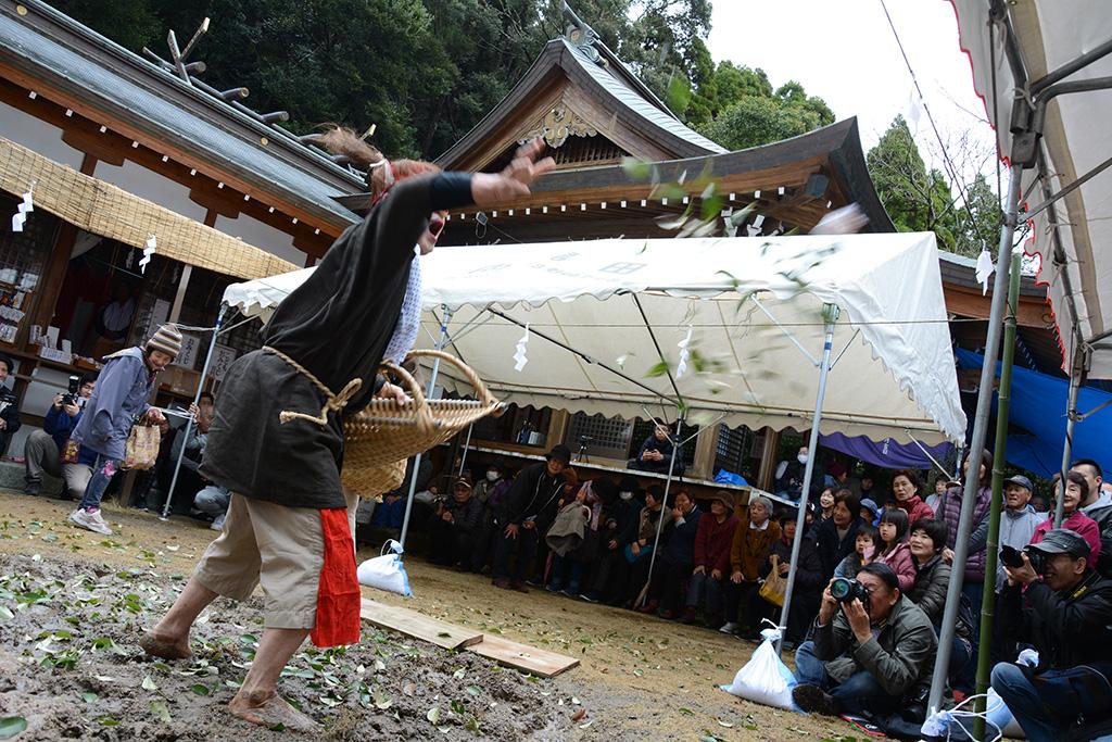 お田植え祭りは、毎年3月3日、湯之元の稲荷神社で行われます。豊作を祈り、200年以上も前から始まったとされ、近隣からたくさんの人が詰め掛けます。境内に水田をかたどり、あぜ塗り、牛を使った田ならし、休憩の茶飲みの様子などを鹿児島弁でおもしろおかしく即興で演じる「田園劇」に、境内は笑いに包まれます。
