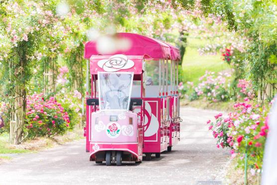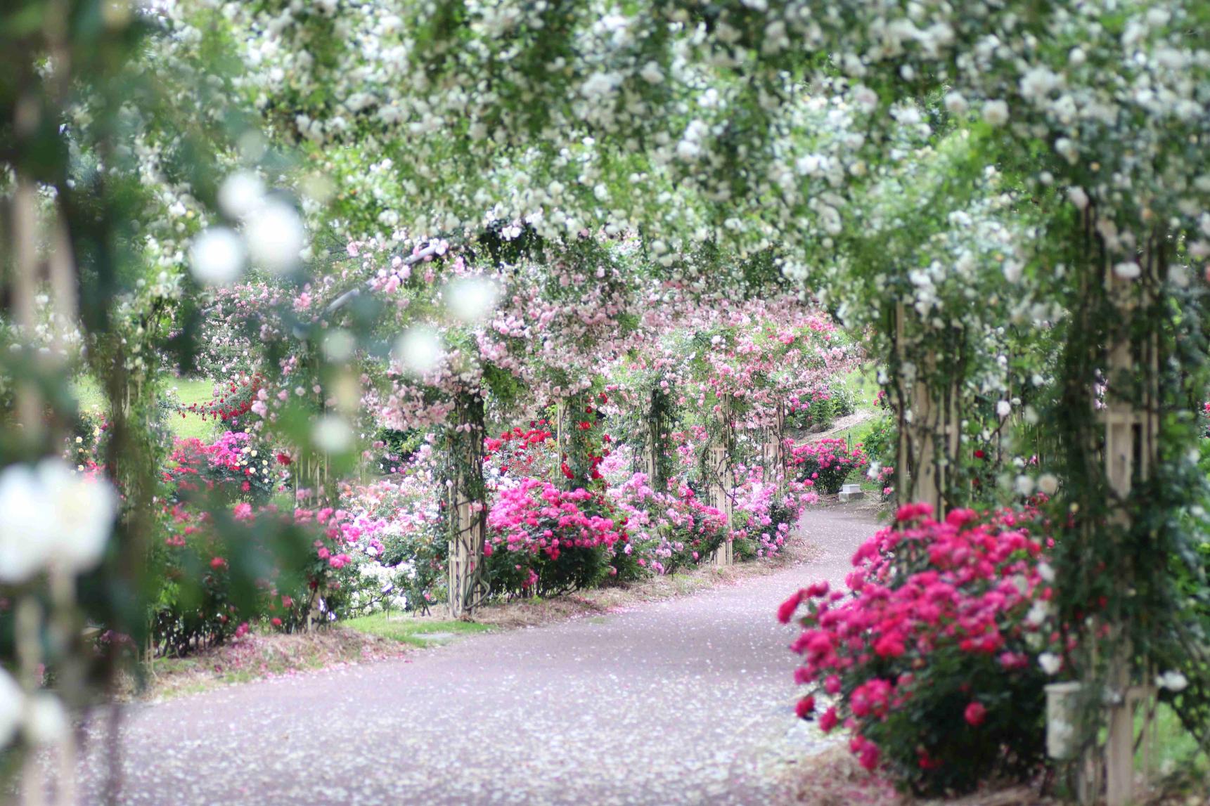 春のバラは、一斉に咲き誇り華やかでボリューム感があり、つるばらアーチは、見るものを魅了するほどの美しさです。
