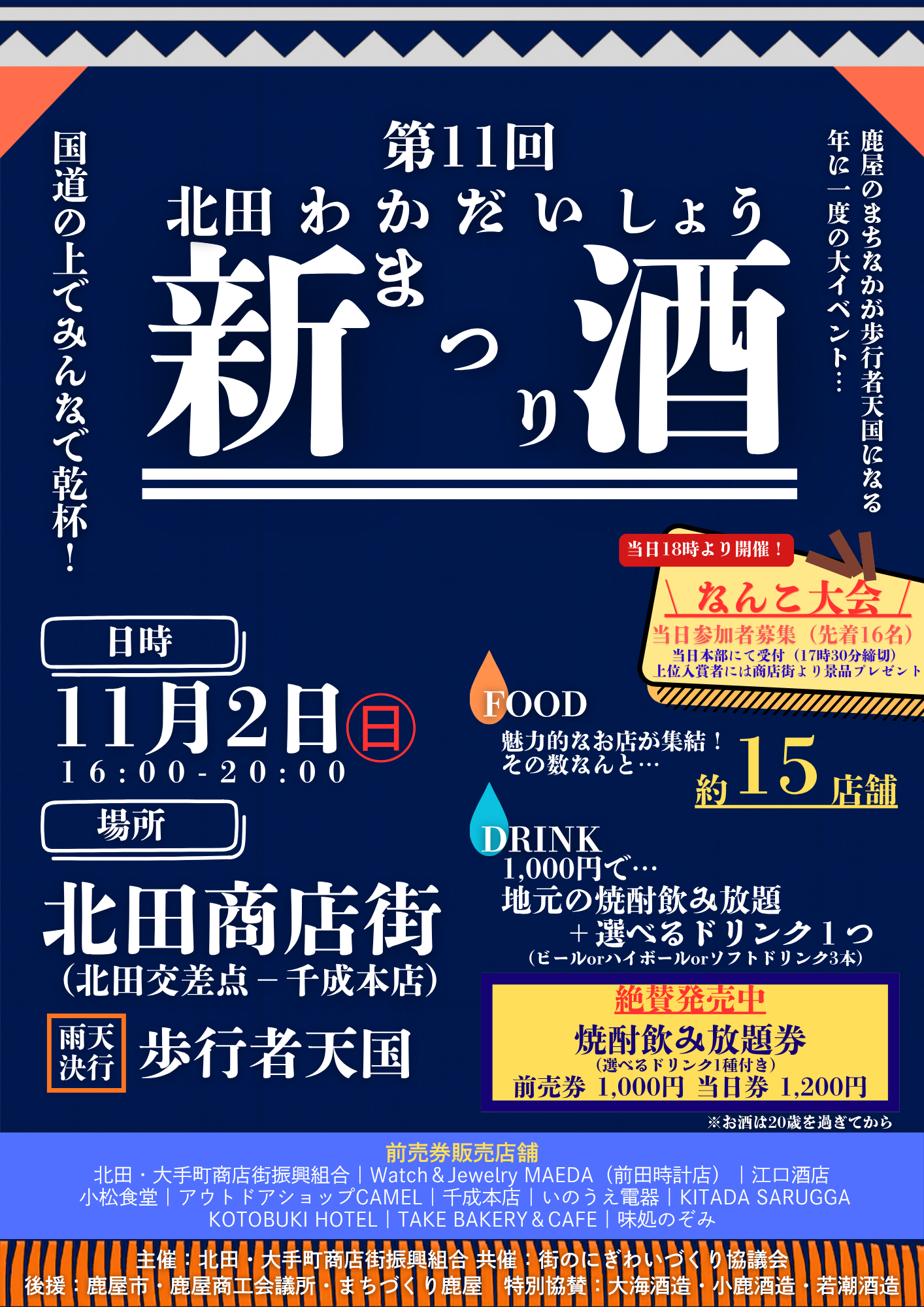 16時からは、「北田わかだいしょう新酒まつり」を開催。飲食ブースには、北田商店街を中心に15の店舗が出店。地元の焼酎が飲み放題の前売券も発売。今回初のイベント「なんこ大会」を開催。懐かしい遊びを体験してみませんか。