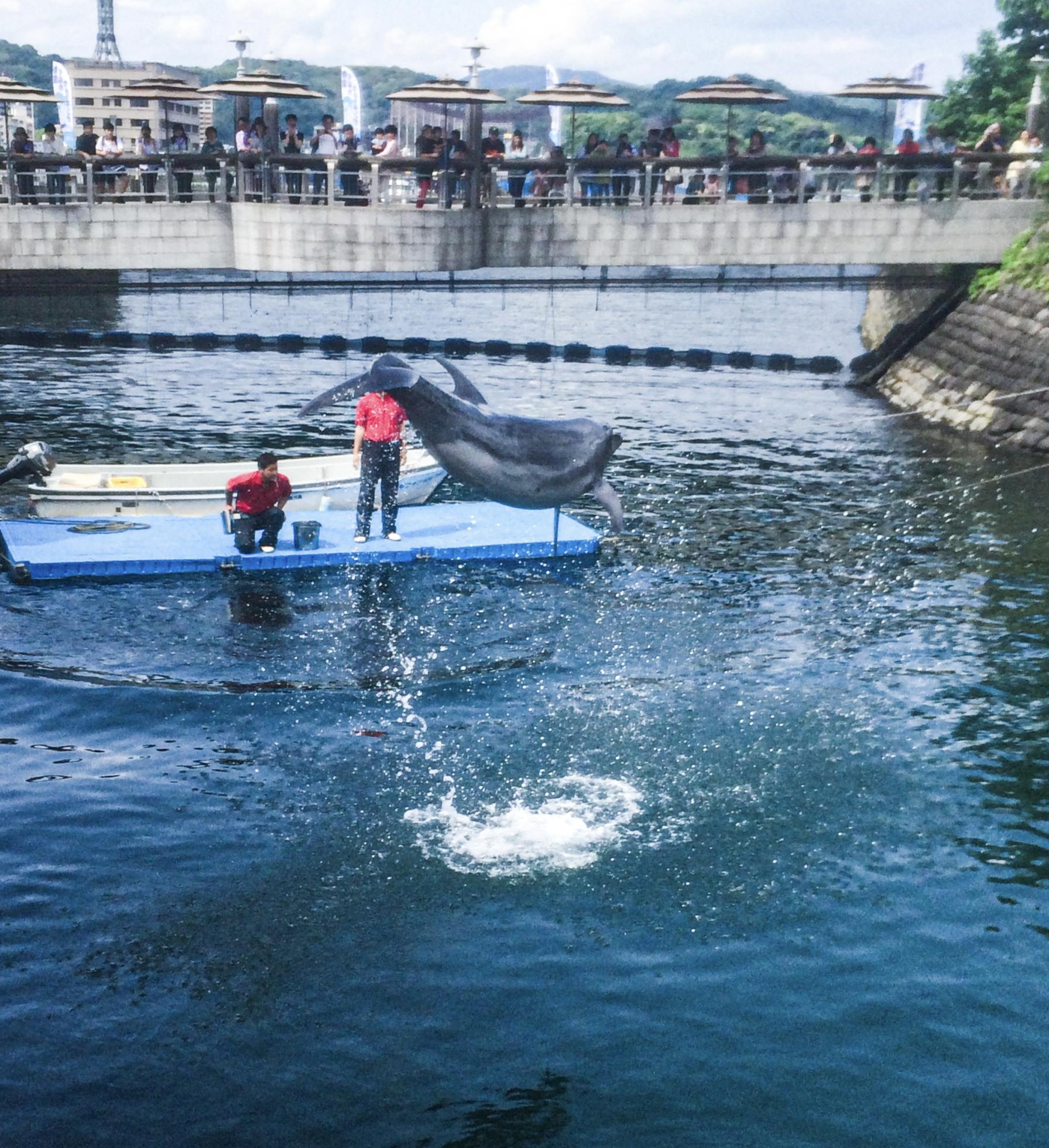 水族館前のイルカ用水路です。イルカのショーの練習をよくしています。以前、「無料でショーが見れる!」と喜んで見に行っていたのを今でも思い出します。