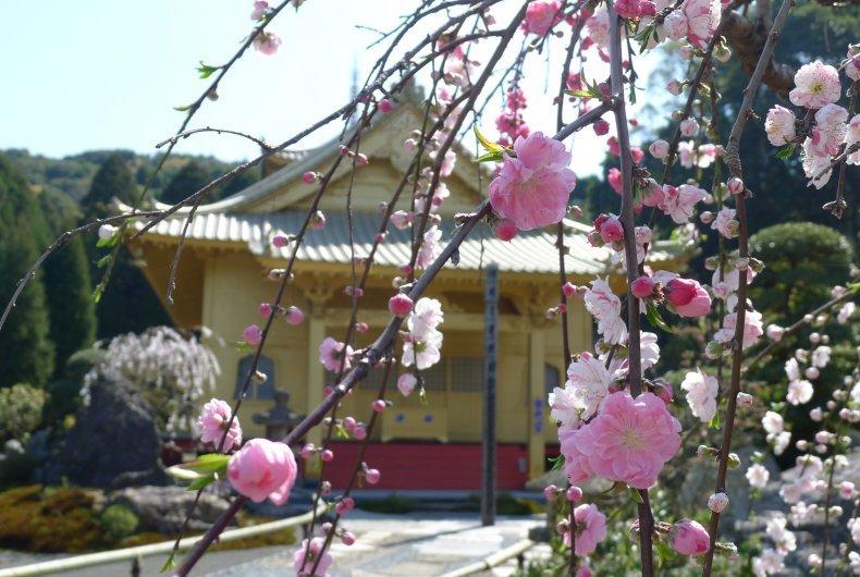 約3万坪の敷地には、僧侶により作庭された日本庭園が広がります。35tの巨石をはじめとする多くの石や苔、数百年前の石燈籠が配され、つつじや枝垂れ桜など四季折々の花々が庭園を彩ります。また、100本を超すもみじが、初夏には瑞々しい若葉を芽吹き、秋には美しく紅葉し訪れた人々の目を楽しませてくれます。