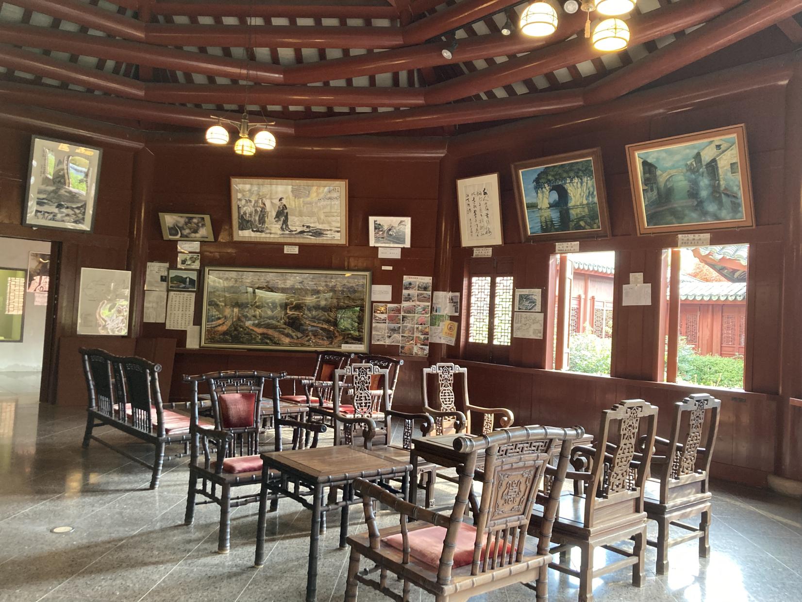 一見,銀閣寺を思わせる建物の和カフェ。伝統的工芸品である『川辺仏壇』の装飾が施された館内は1階がカフェ、2階はワークスペース。公園内を散策した後の憩いのスポット。