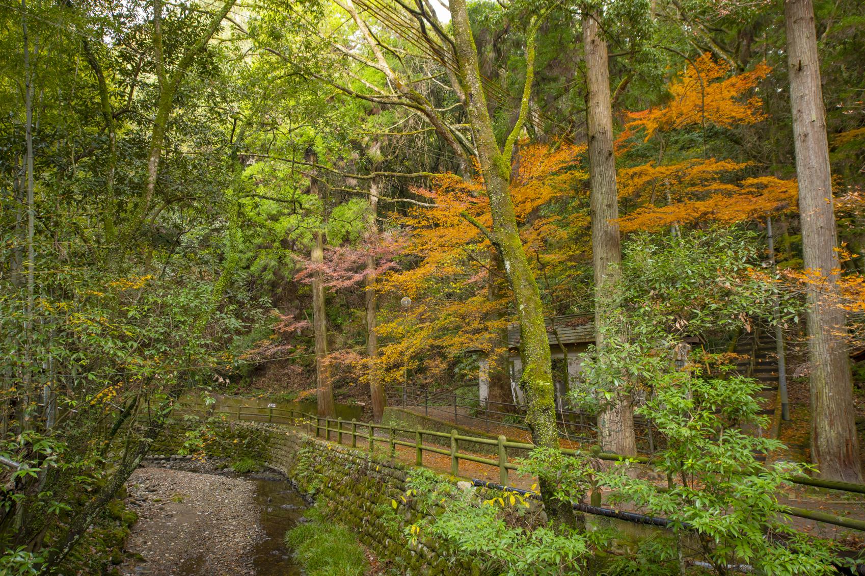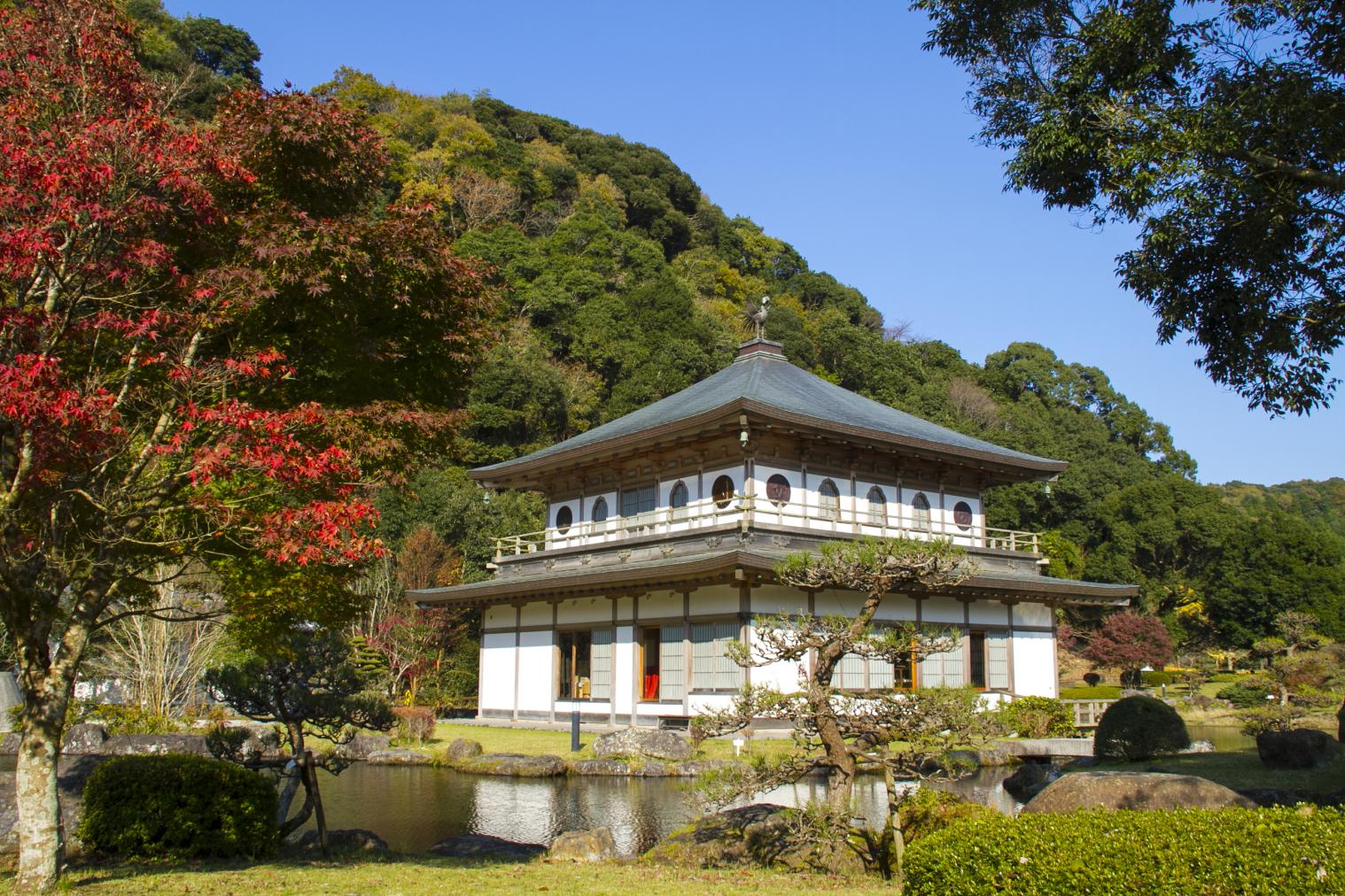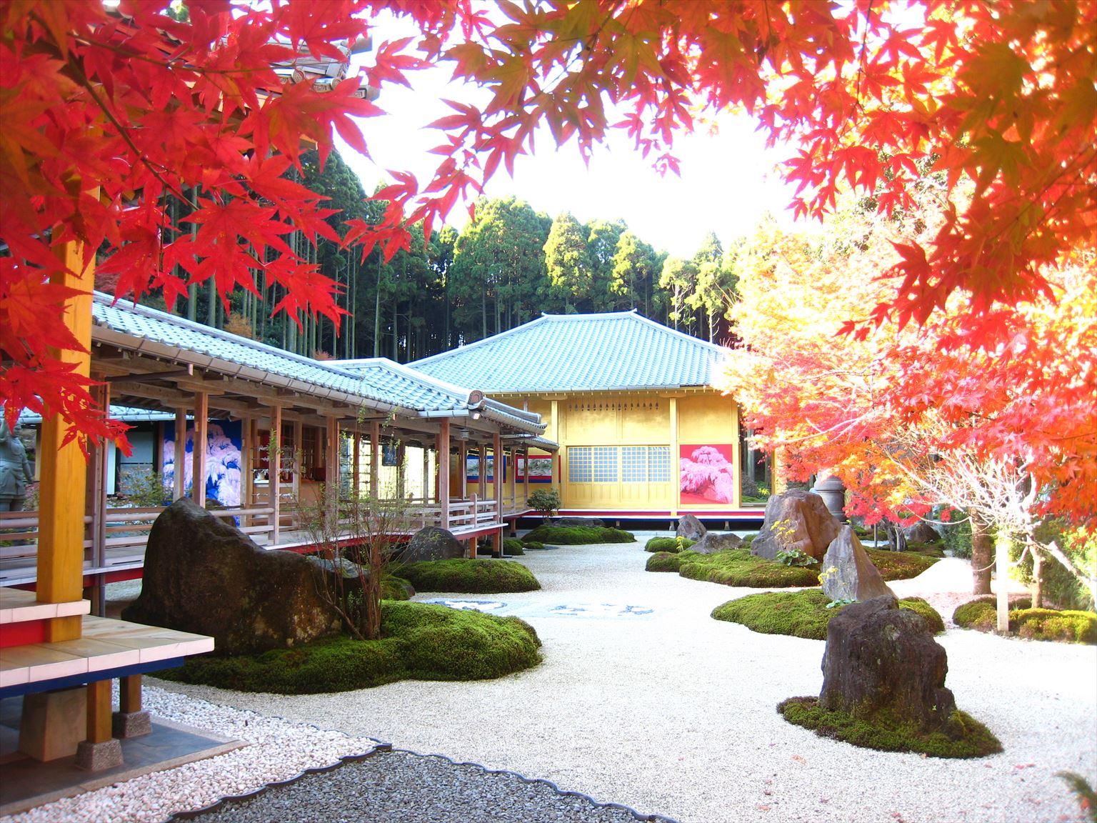 1990年(平成2年)に開山された真言宗の寺院 標高300メートルの山中に、九州では珍しい本格的伽藍が配されてます。約3万坪の敷地には、僧侶により作庭された日本庭園が広がります。35トンの巨石をはじめとする多くの石や苔、数百年前の石燈籠が配され、つつじや枝垂れ桜など四季折々の花々が庭園を彩ります。また、100本を超すもみじが、初夏には瑞々しい若葉を芽吹き、秋には美しく紅葉し訪れた人々の目を楽しませてくれます。