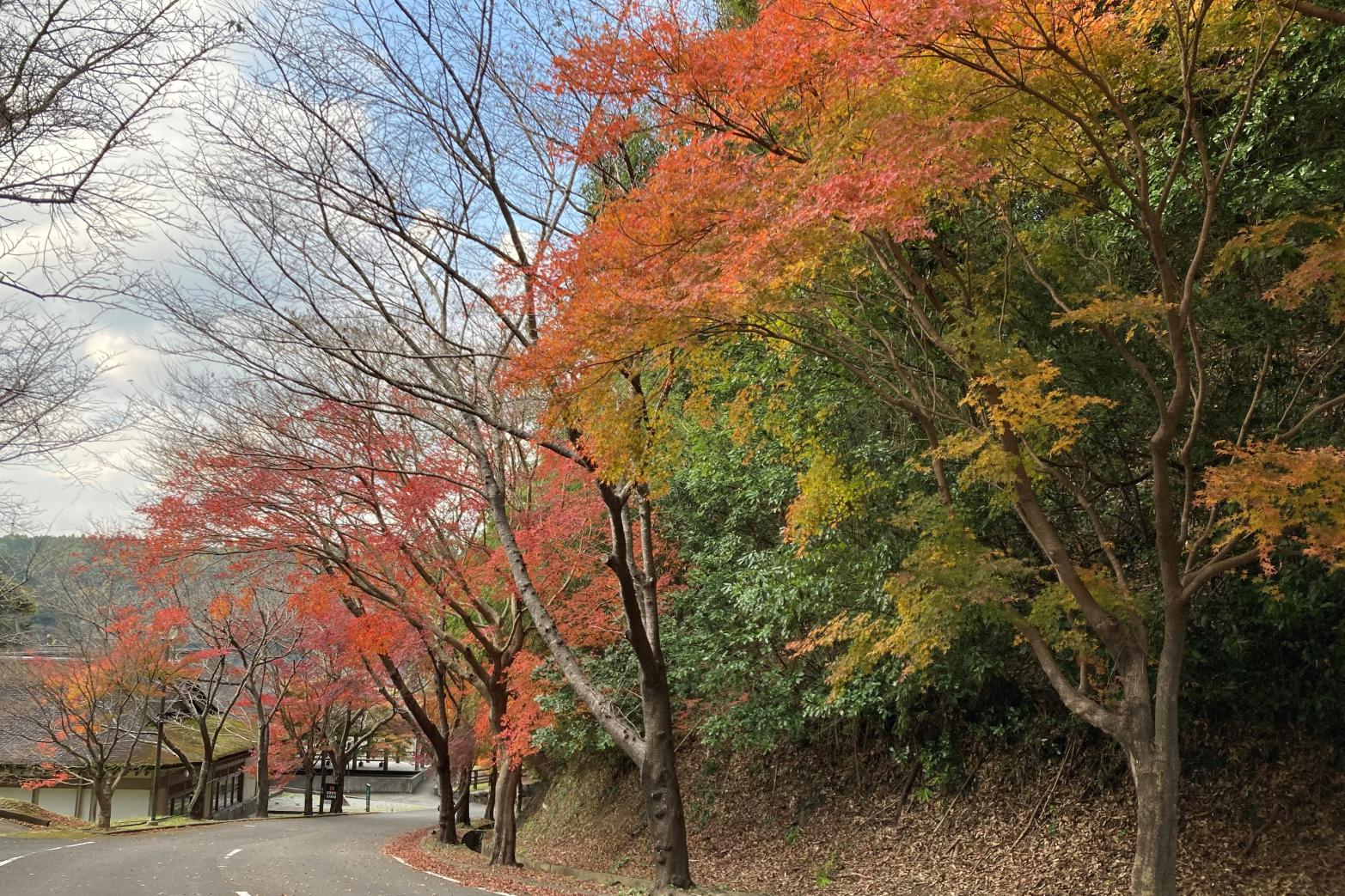 全国的にも貴重な「磨崖仏群」に隣接。紅葉の赤色、イチョウの黄色が園内を鮮やかに彩ります。 川辺仏壇の技術を結集して作られた銀閣寺を思わせるカフェ『サクラノヤカタ』もおすすめ。紅葉を楽しんだ後は是非足を運んで、季節のスイーツや温かい飲み物をどうぞ。