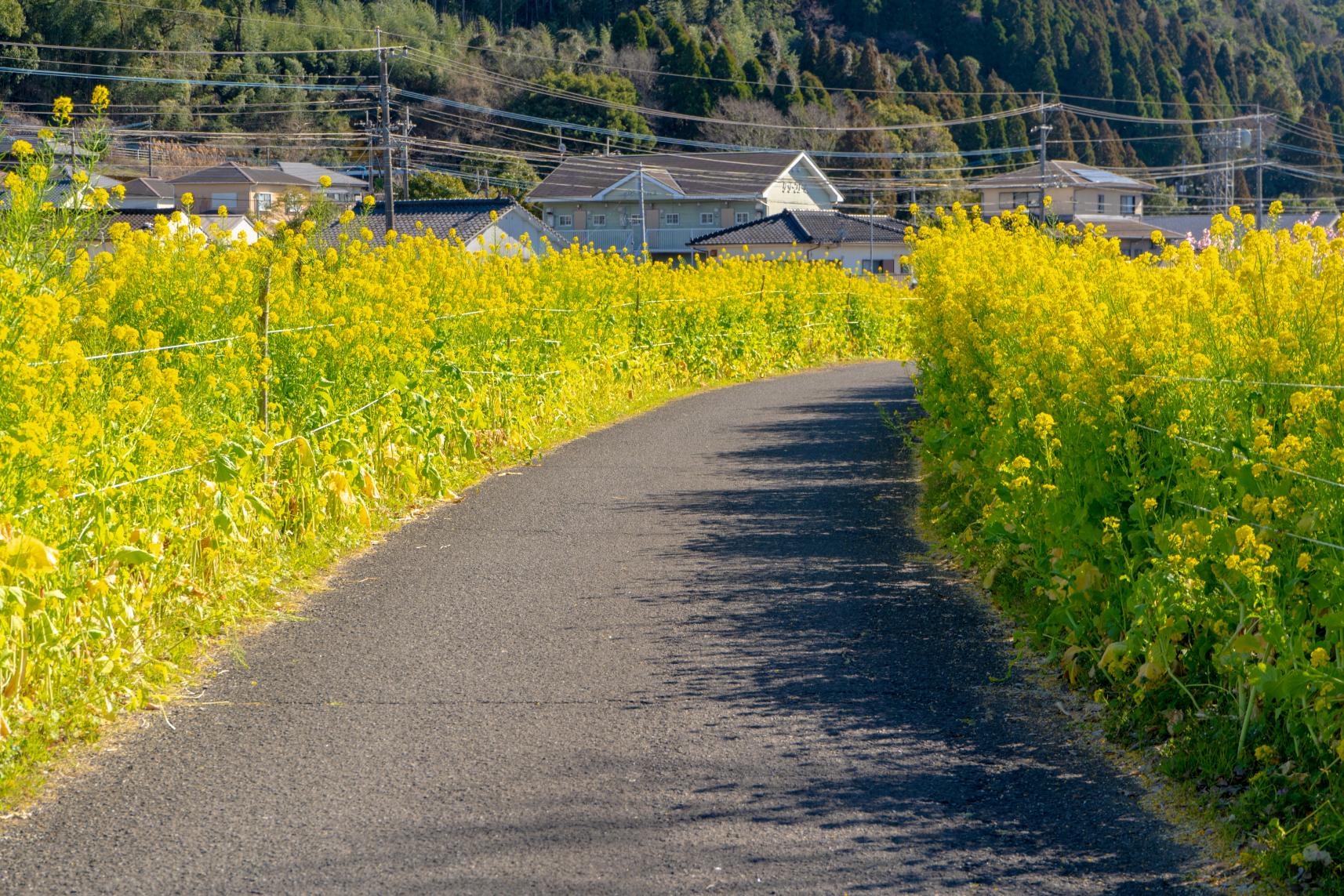 姶良市加治木町の日木山川沿いに広がる「菜の花ロード」。道の両側に約800mにわたって咲き誇る菜の花が見事な黄色いじゅうたんを作り出し、川の土手も鮮やかな景観に包まれます。毎年開催される「菜の花ウォーキング」の開催地としても知られ、地元の人々はもちろん、観光客にも人気のスポットです。