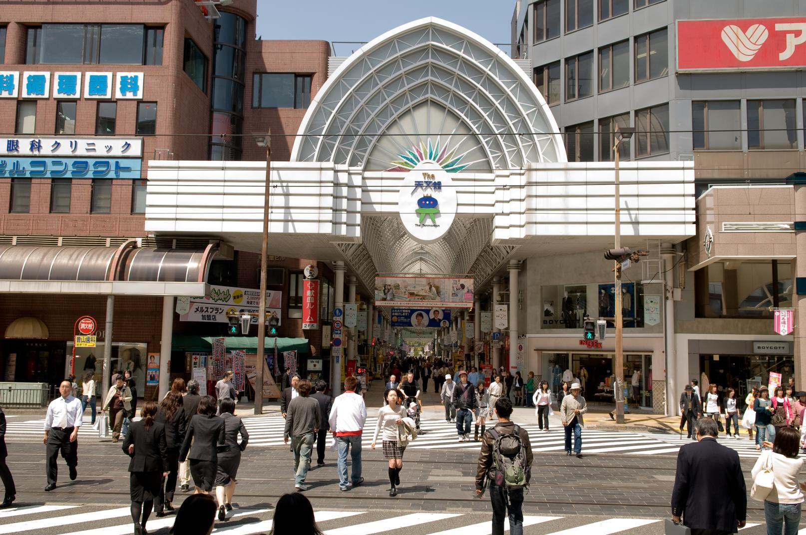 The name refers to an expansive shopping area with the Tenmonkan tram stop at its center.