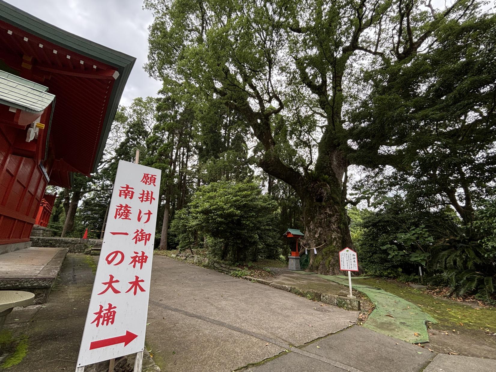 創建は不明ですがニニギノミコトが霧島に降臨した後、しばらく宮居されたと言われる場所です。明るい赤塗りと彫刻の美しい宮で、古事記に記されている貝のモニュメントもあり、毎年元旦に吹上浜の砂を盛った貝をお供えします。500年の歴史がある流鏑馬も毎年11月23日に行われています。境内には、樹齢千年以上、幹回り約14mの立派な御神木の他、願いを叶えてくれるオットゲ石、夫婦銀杏、子産み石、縁結の榊、福を授けるフクロウなど、さまざまなパワーアイテムが境内にあります。また参道にある「千本楠」とよばれる楠木群も必見です。