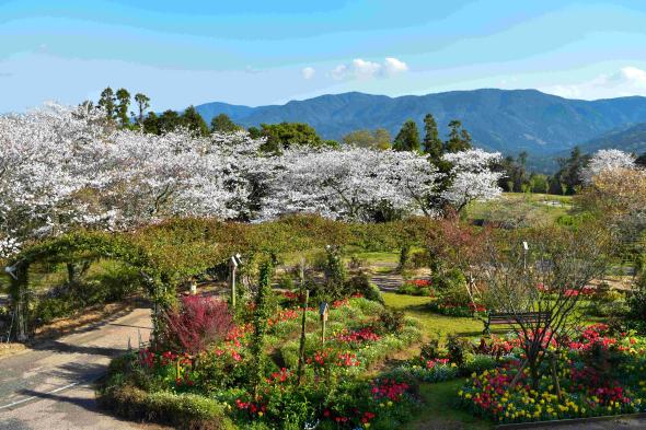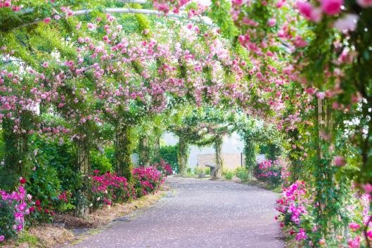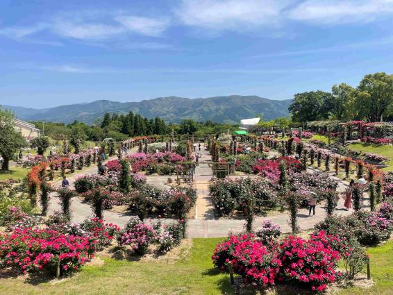 「かのやばら園」は、8haの敷地に約35,000株のばらが植えられている日本最大級のばら園です。広い園内には、王族や貴族の名前がついたばらを集めた「ロイヤルガーデン」やさまざまな香りのばらがある「香りのガーデン」などテーマごとに分けられ、温室では切花体験(有料)も楽しめます。春と秋には「ばら祭り」も開催され、多くの人でにぎわいます。ばら園オリジナルの「バラソフト」や「薔薇カレー」も大人気!